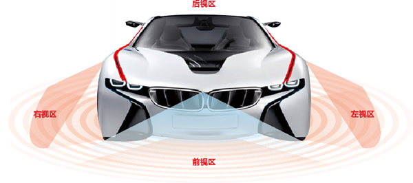 360度全景泊車影像通過安裝在車身前后左右的4個廣角攝像頭,同時采集車輛四周的影像,經過圖像處理單元矯正和拼接后,形成一幅車輛四周的全景俯視圖,實時傳送到中控臺的顯示設備上(如DVD導航)。駕駛員坐在車中即可直觀地看到車輛所處的位置以及車輛周圍的障礙物,從容操控車輛泊車入位或通過復雜路面。